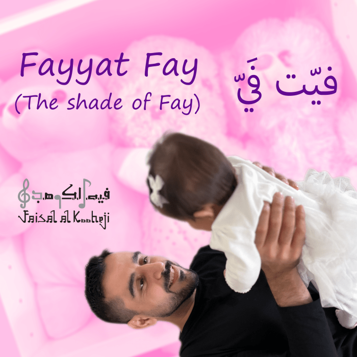 I am very excited to announce that finally my new song Fayyat Fay was released this morning after a delay due to a little issue. (Fayyat Fay) in my local Arabic accent, The Shade Fay in English, is my special way of welcoming my little princess Fay, our daughter, who was born in last October. … Continue reading Fayyat Fay is released