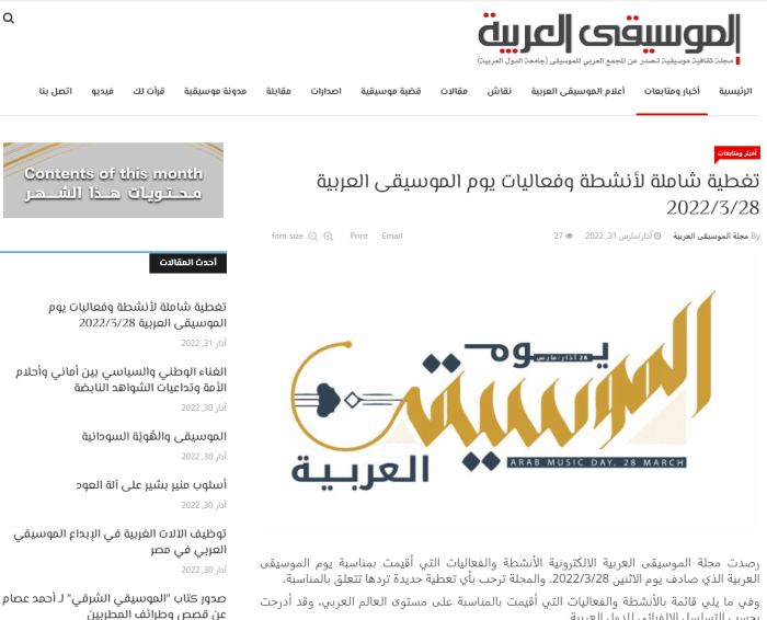 The Arab Music Magazine, issued by the Arab Academy of Music (part of the Arab League), posts about Bahraini Musician Faisal Al Kooheji's participation in the Bahrain IVLP Alumni Association Event at Bahrain Cinema Club on the occasion of the Arab Music Day on 28 March 2022 as he performed his original piece "Safar" (Journey). … Continue reading Arab Music Magazine